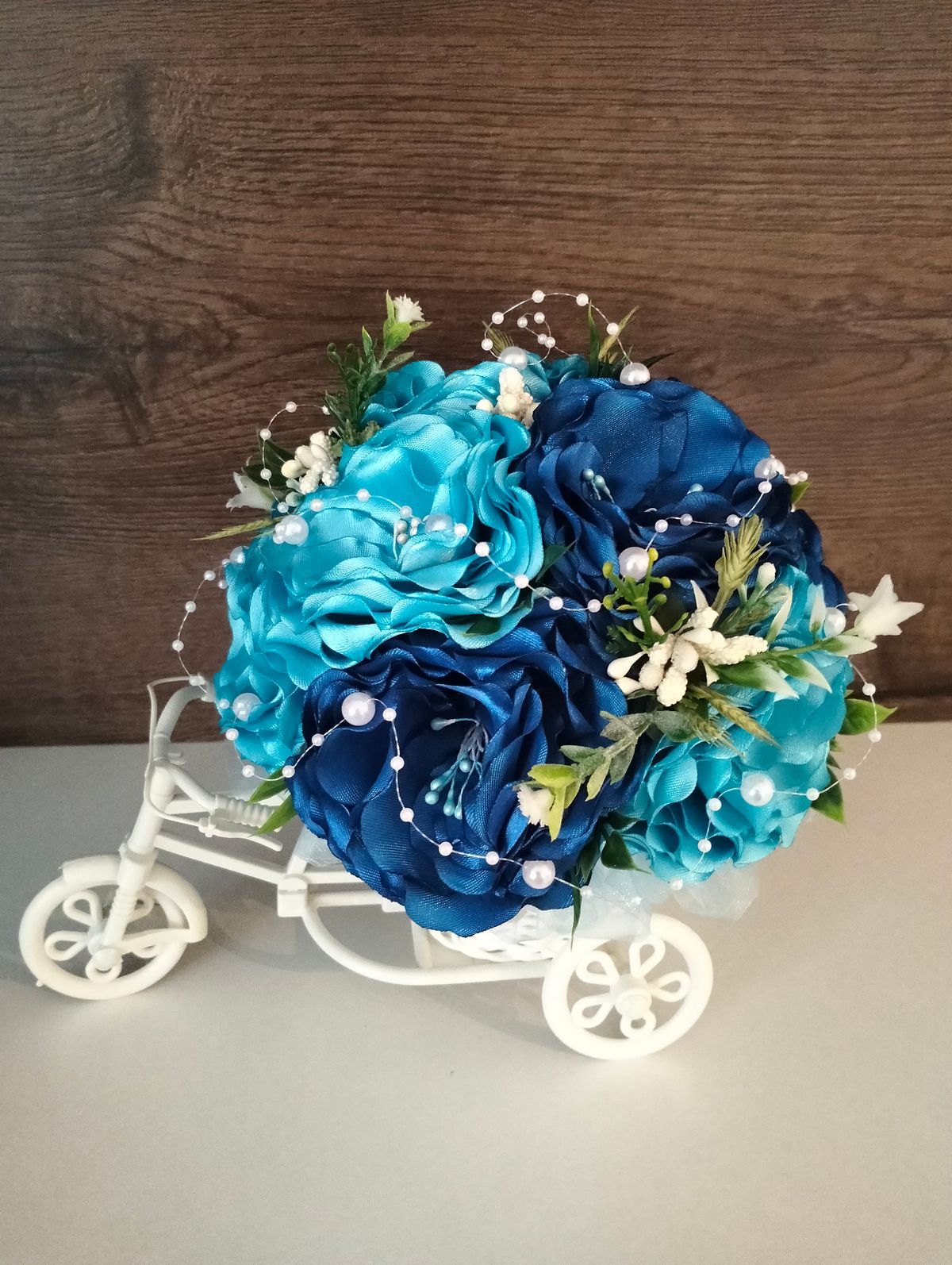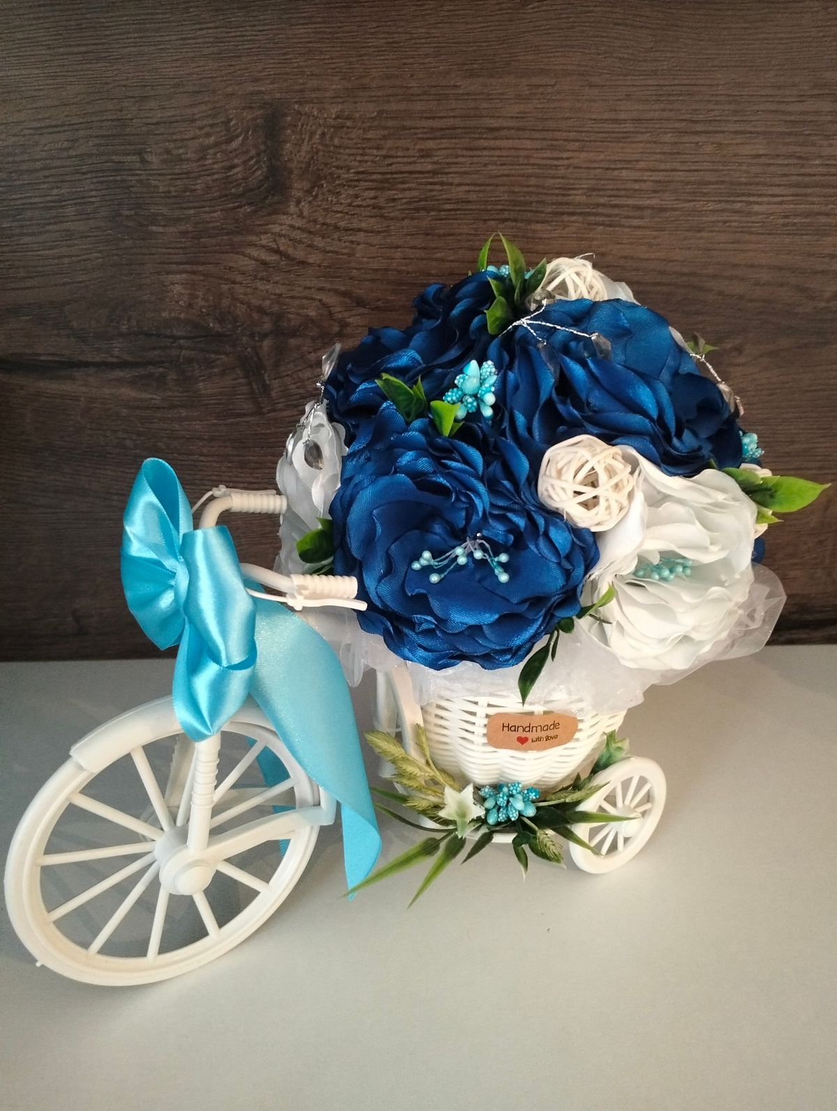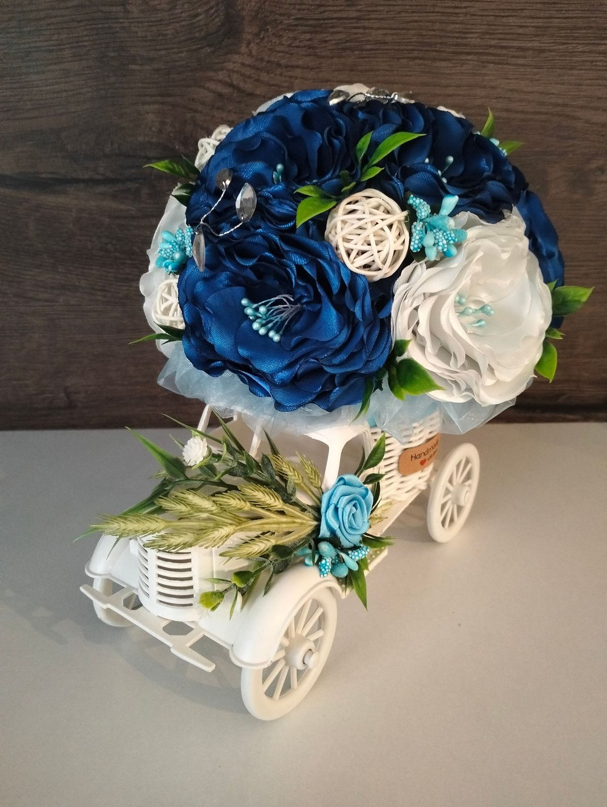 Rowerek ratanowy na dużym kole zdobiony kwiatami szytymi ręcznie z wstążki satynowej. W kolorze granatu, niebieskiego.