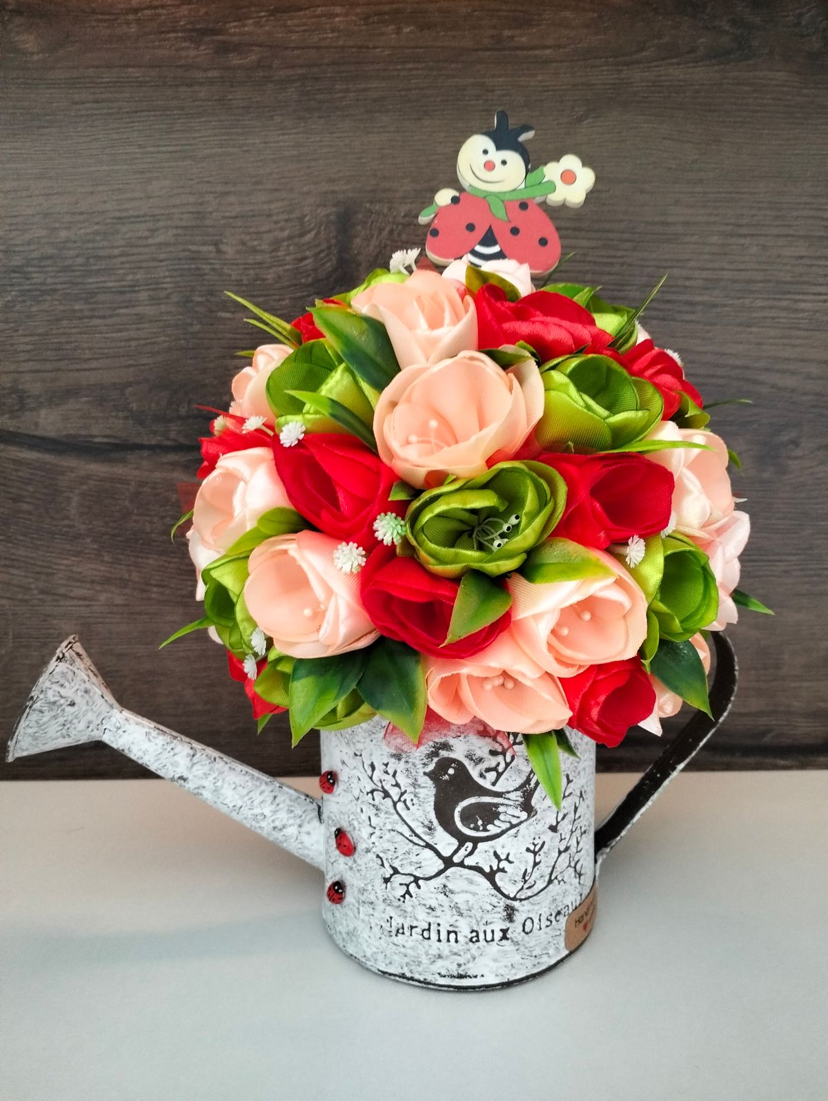 Konewka metalowa Duża. Zdobiona tulipanami szytymi ręcznie, w odcieniu czerwieni, zielonego i delikatnego koloru łososia.