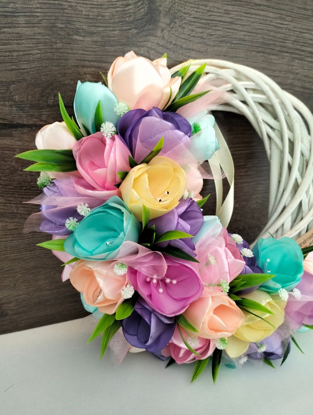 Wianek na kole ratanowym, w wiosennych kolorach żółty, pomarańczowy, różowy, fioletowy i zielony. tulipany wykonane z wstążki satynowej