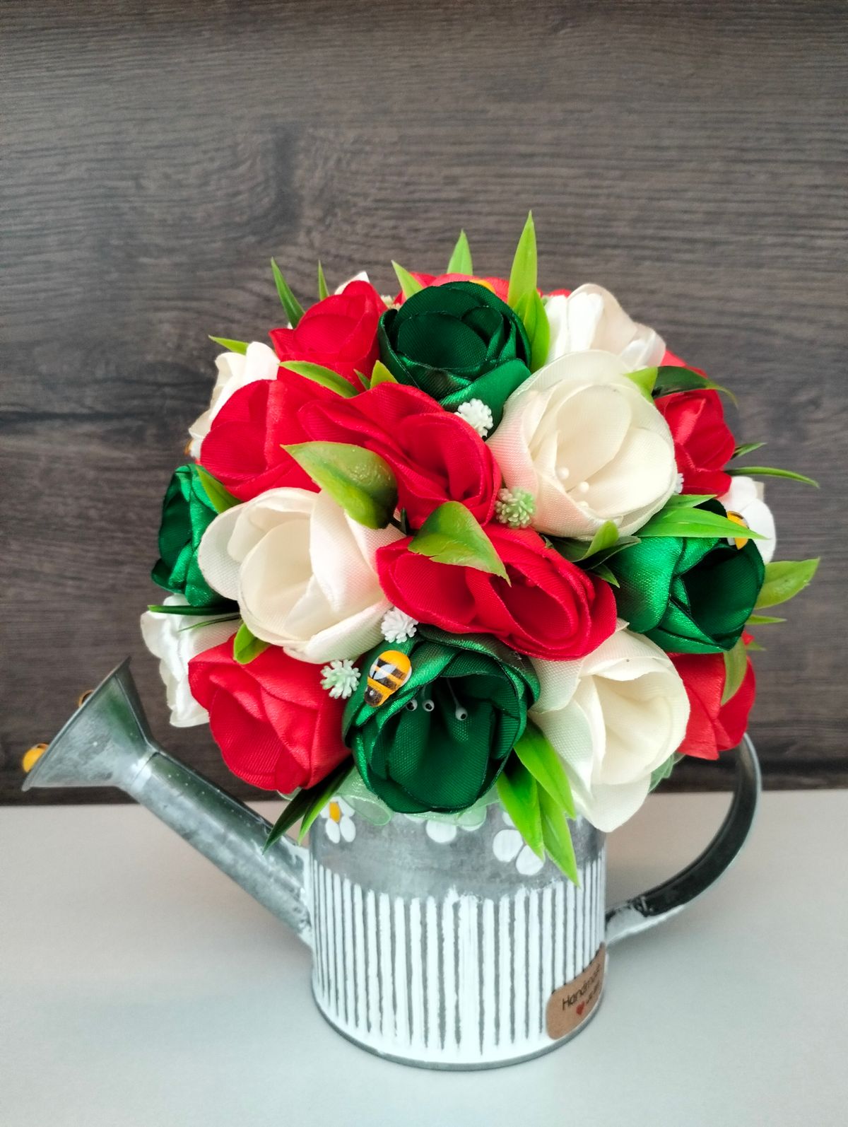 Konewka MAŁA zdobiona tulipanami szytymi ręcznie,w kolorach czerwień, zieleń i beż