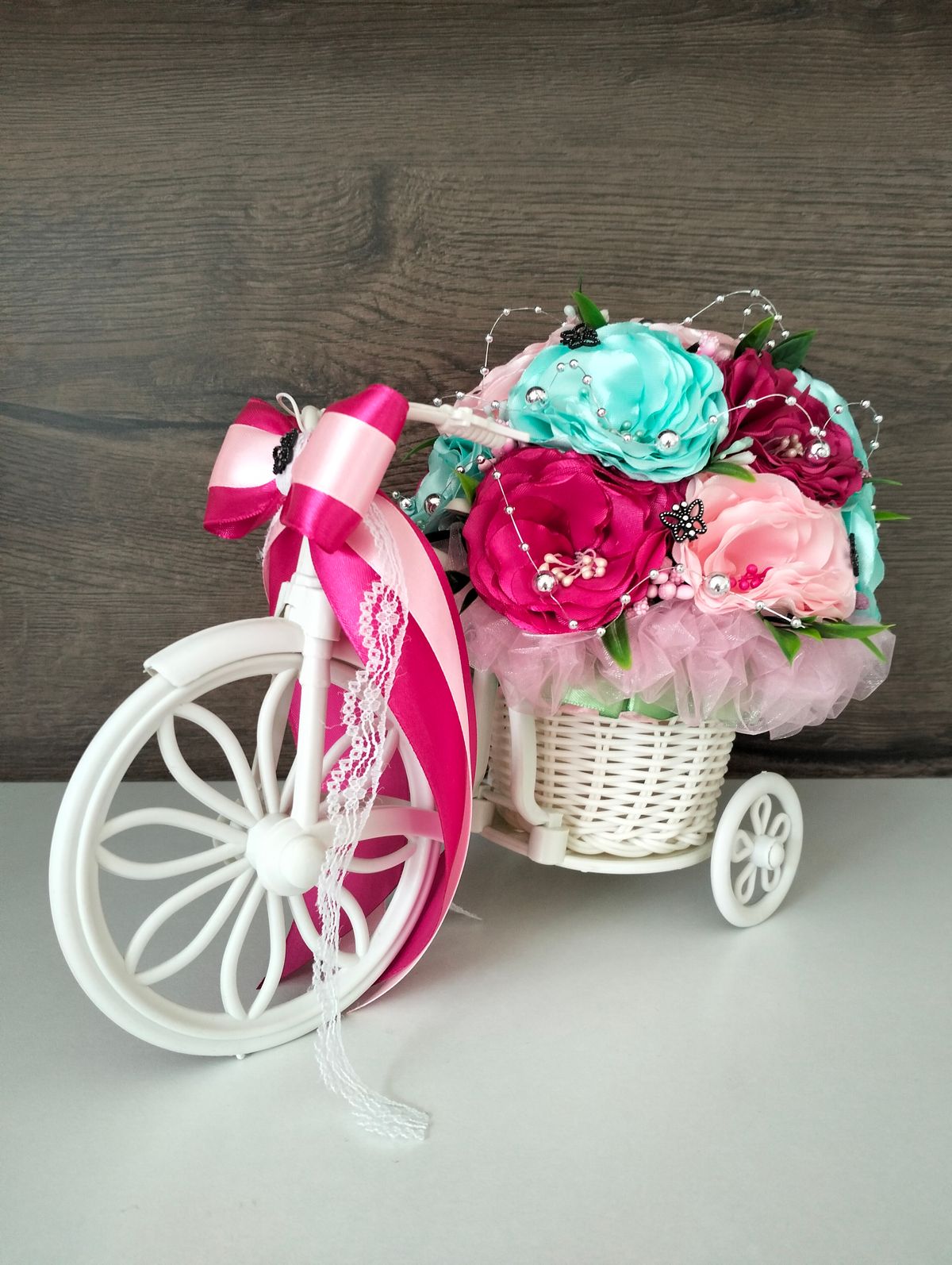 Rowerek ratanowy, zdobiony kwiatami szytymi ręcznie z wstążki satynowej. W kolorze mięty, ciemnego i jasnego różu
