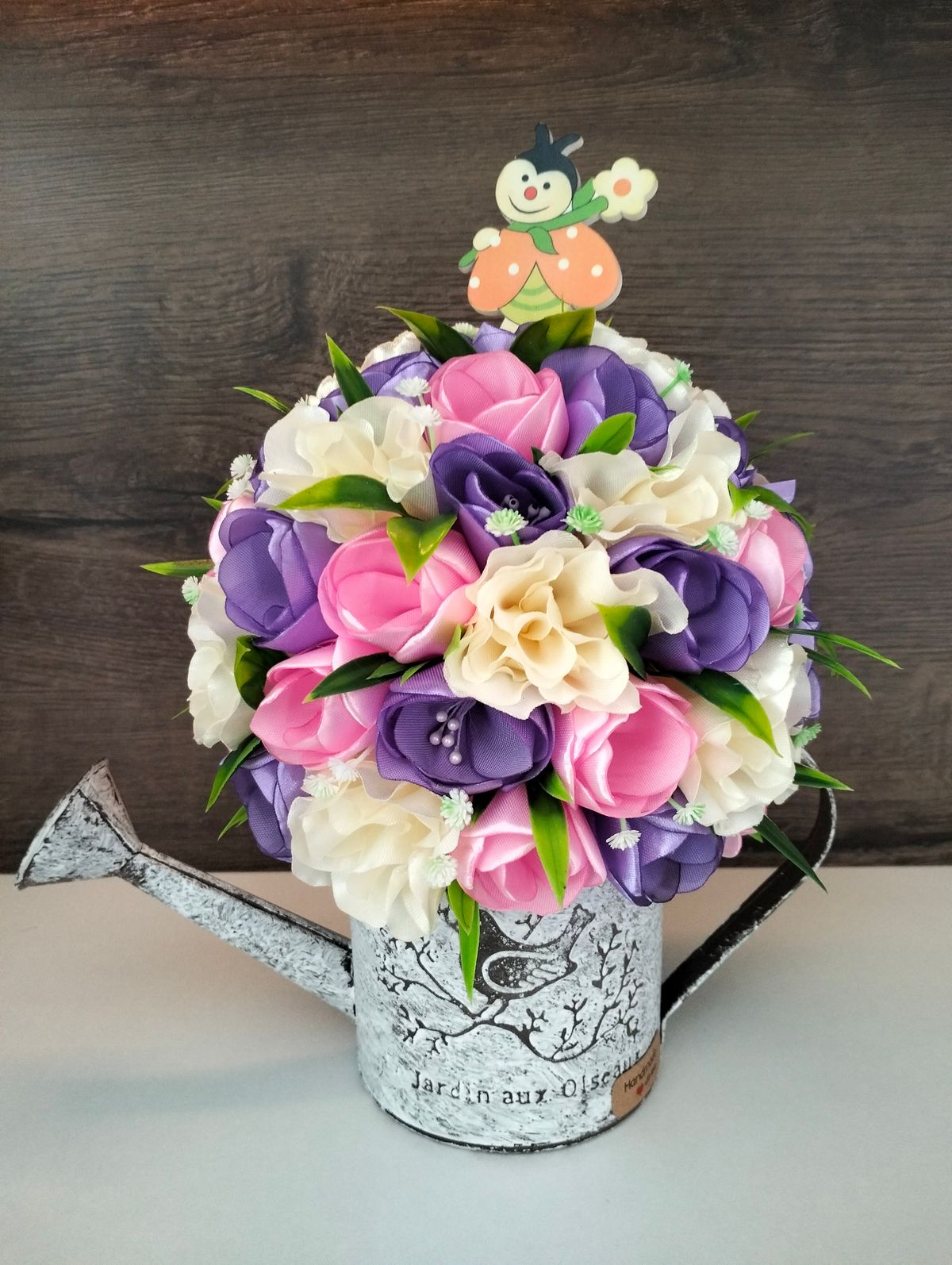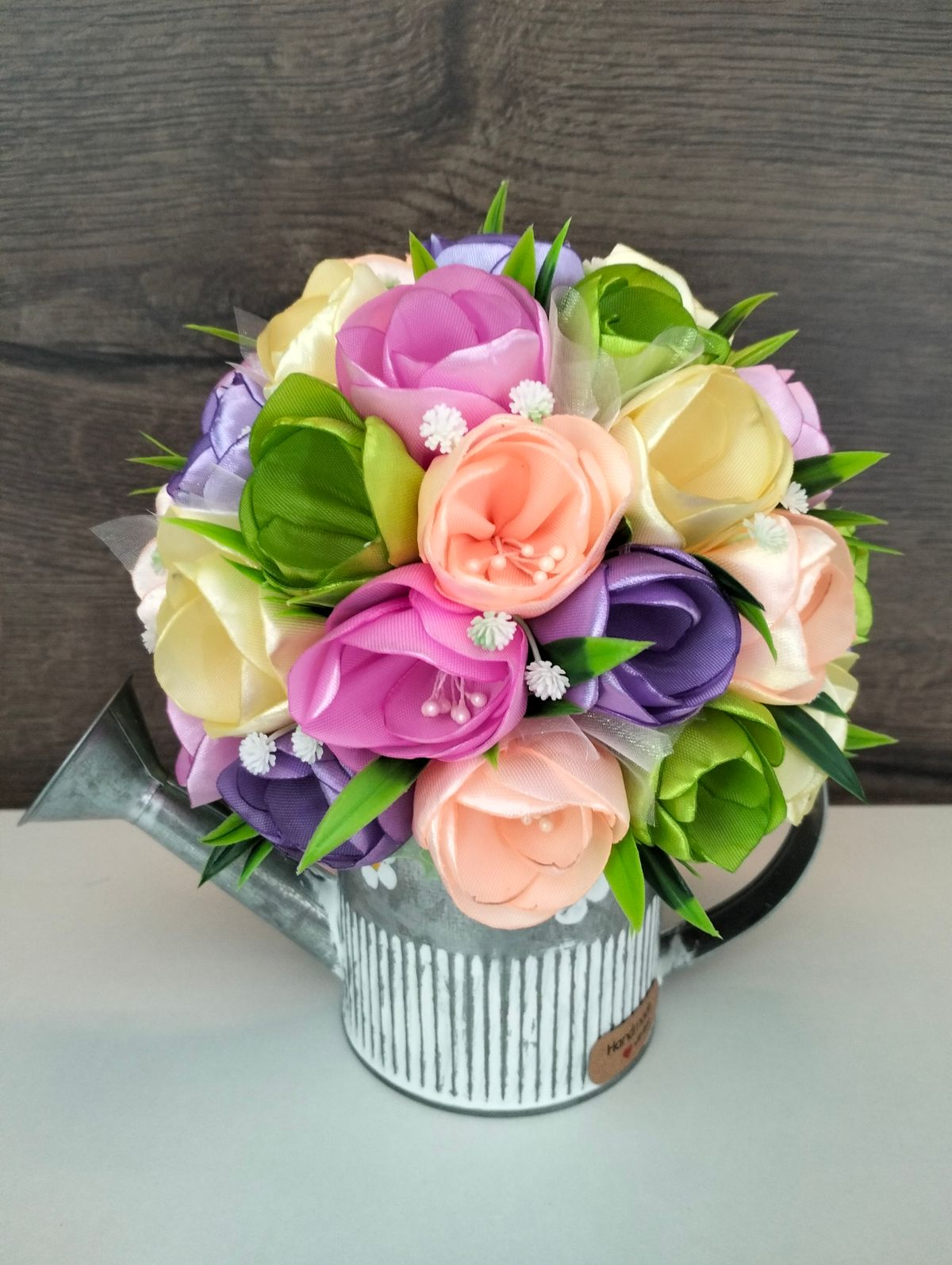 Konewka metalowa Duża zdobiona tulipanami szytymi ręcznie w kolorze jasnego różu, beżu i fioletu
