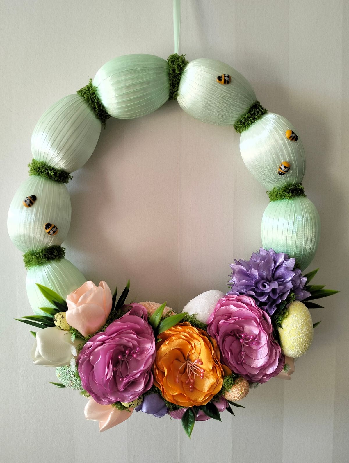 Wianek wielkanocny z jajek w kolorze mięty, z dodatkiem odcieni fioletu i pomarańczy.