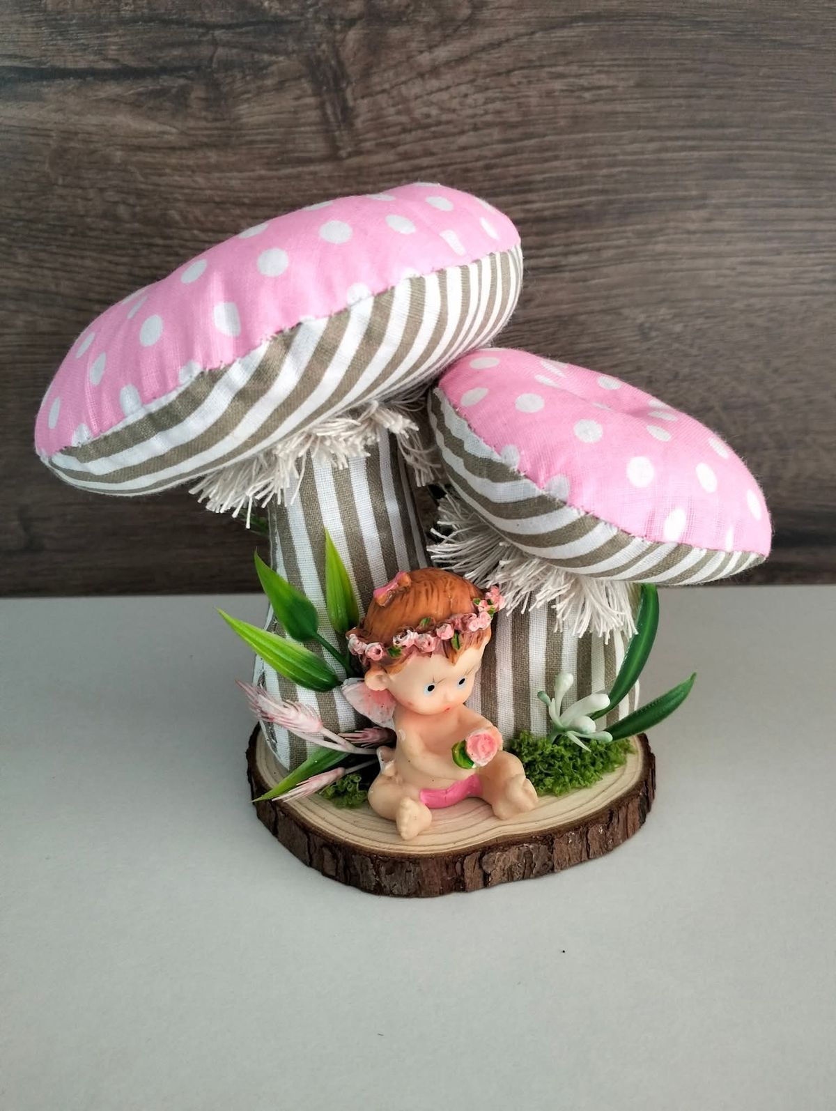 Grzybek z elfem z materiałów bawełnianych szyty ręcznie