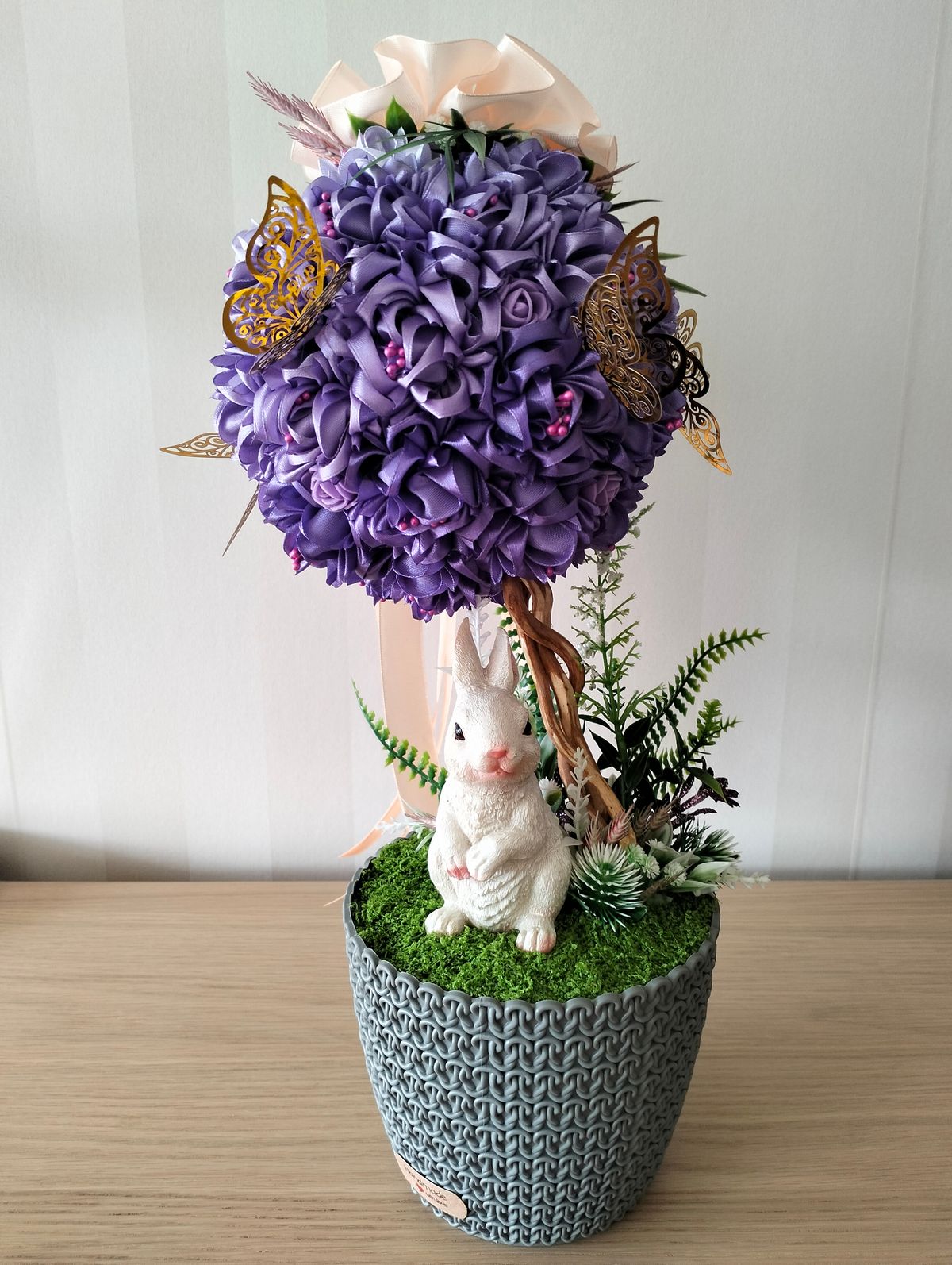 Drzewko dekoracyjne zdobione odcieniami fioletu, kwiaty szyte ręcznie.Z dodatkiem koloru łososia i figurka zajączka. Ok 35cm
