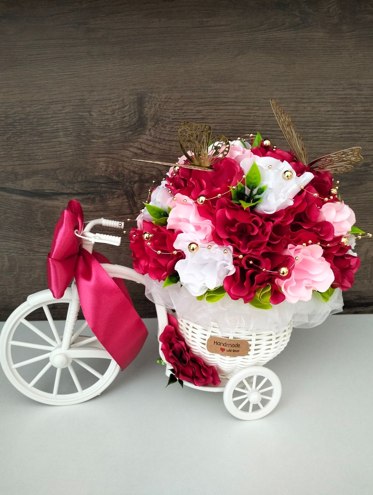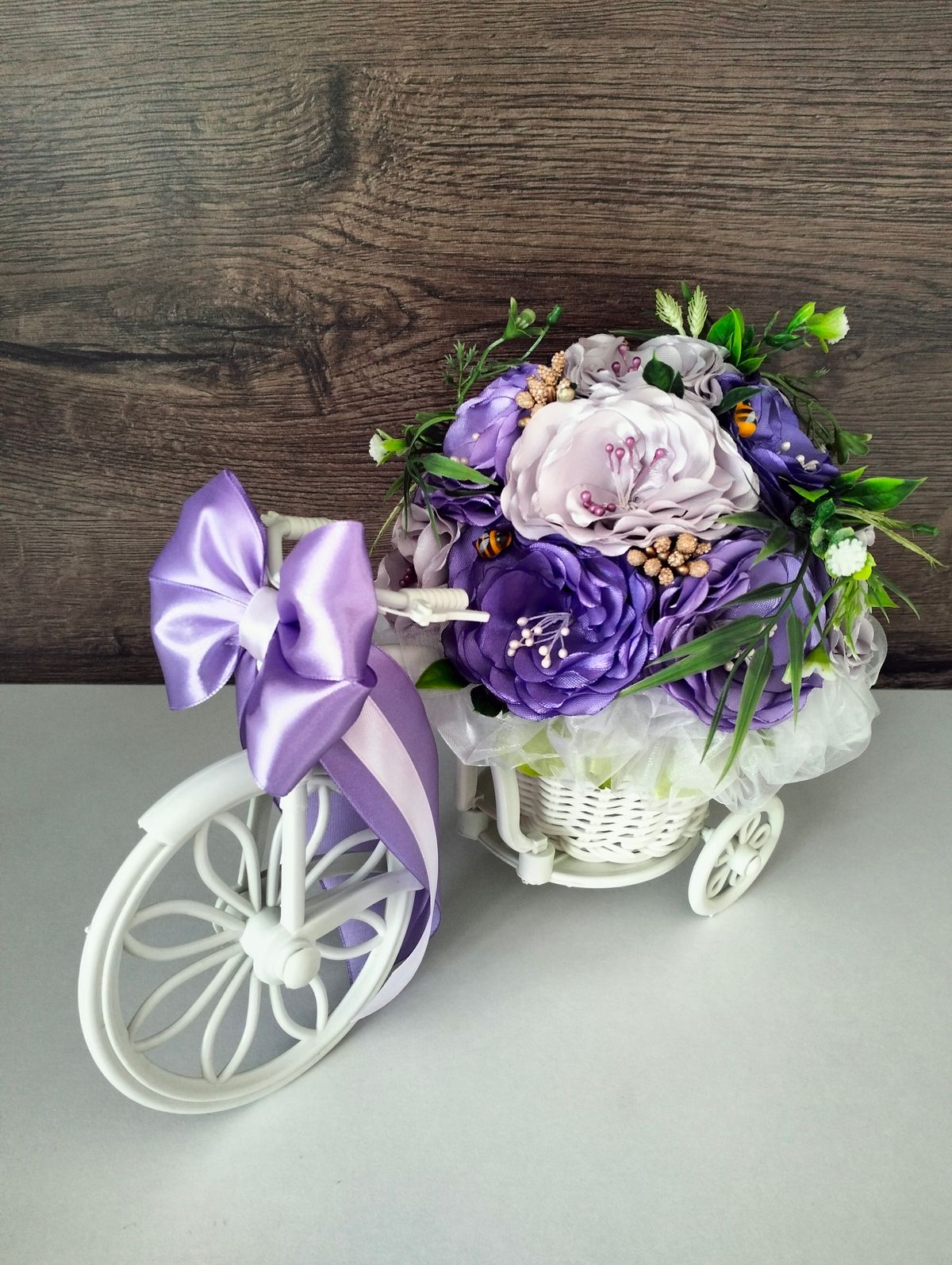 Rowerek ratanowy z okazji ukończenia studiów na dużym kole. W pięknych kolorach złoto, brąz i bez. Kwiaty szyte ręcznie