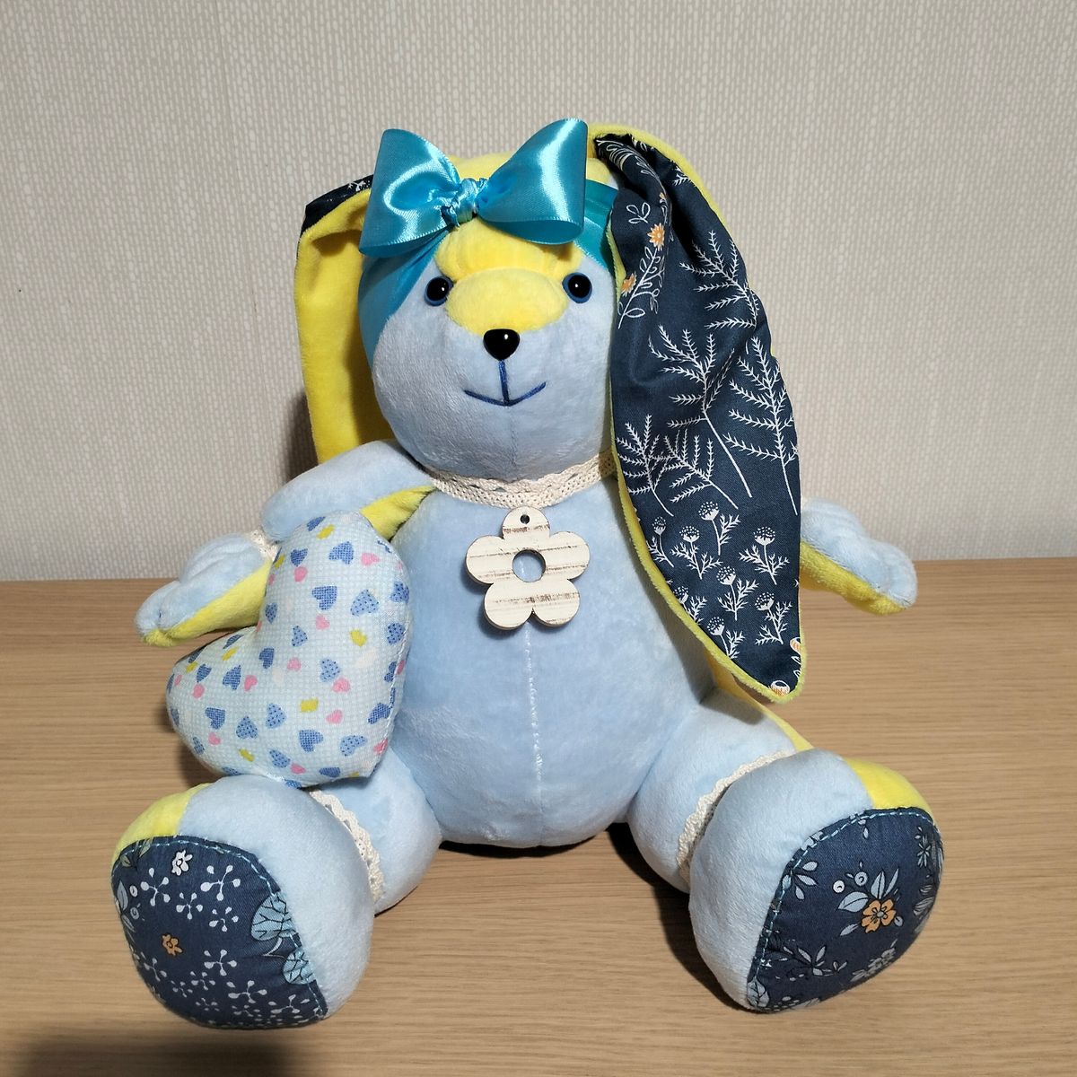 Króliczek z serduszkiem ręcznie szyty, w kolorze niebieskim i żółtym